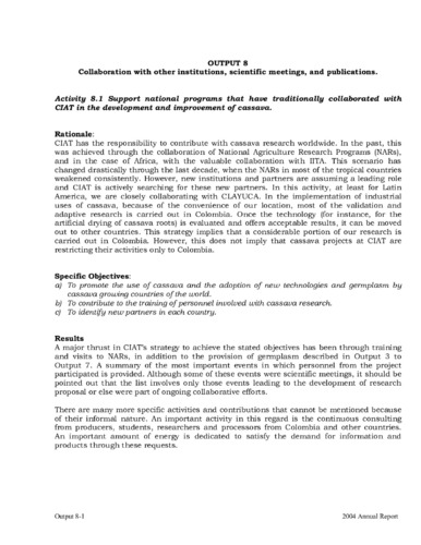 Collaboration with other institutions, scientific meetings, and publications: Output 8. 2004. In: Centro Internacional de Agricultura Tropical. Improved Cassava for the Developing World: Project IP-3: Summary Annual Report 2004. CIAT, Cali, CO. p. 8-1/8-13.