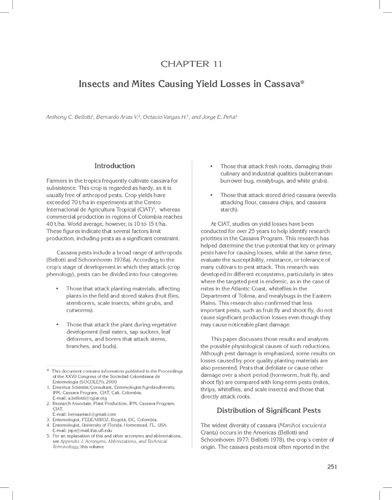 Bellotti, Anthony C.; Arias V., Bernardo; Vargas H., Octavio; Peña, Jorge E.. 2012. Insects and mites causing yield losses in cassava . In: Ospina Patiño, Bernardo; Ceballos, Hernán (eds.). Cassava in the third millennium: Modern production, processing, use, and marketing systems . Centro Internacional de Agricultura Tropical (CIAT); Latin American and Caribbean Consortium to support Cassava Research and Development (CLAYUCA); Technical Centre for Agricultural and Rural Cooperation (CTA), Cali, CO. p. 251-264. (Publicación CIAT No. 377)