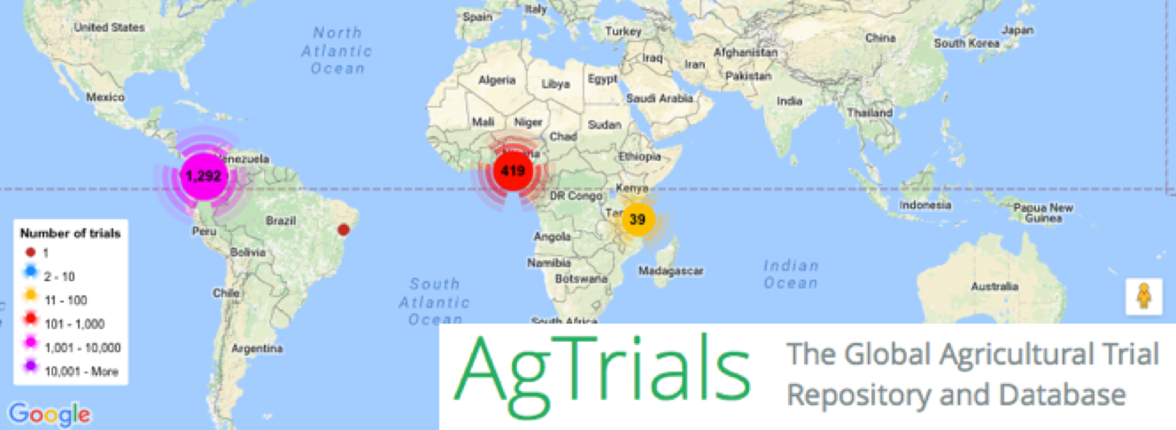 An overview map of existing cassava trials around the globe, as queried from the AgTrials.org Repository on 16 October 2016. Note no trials reported for Asia.