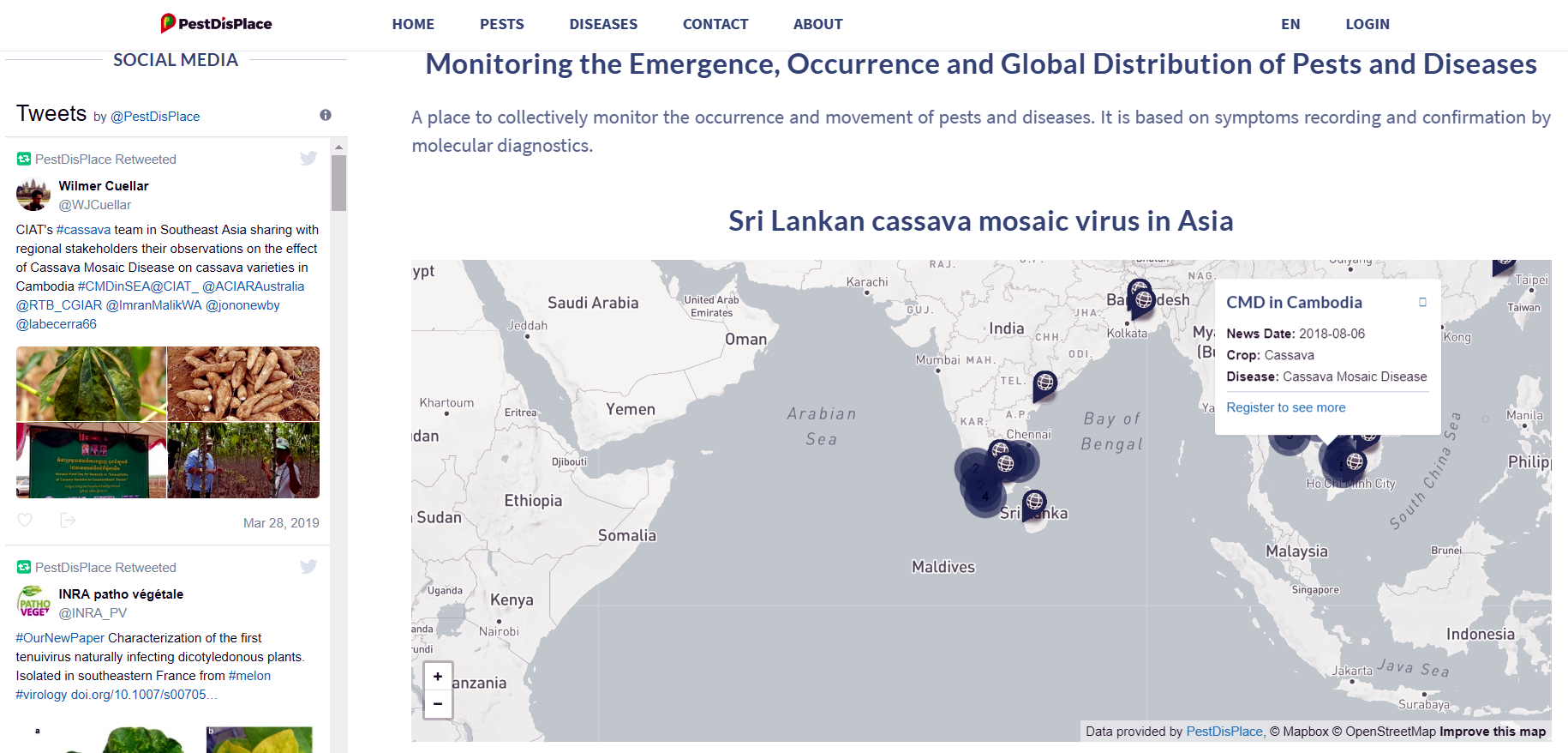 En este momento, cualquier científico puede acceder a más de mil datos o informes de brotes que afectan a la yuca y otros cultivos, incluso sin necesidad de iniciar sesión en la aplicación. Los datos actualmente provienen de proyectos colaborativos entre CIAT y grupos de investigación en Argentina, Perú, Colombia, Camboya, Vietnam y otros países.