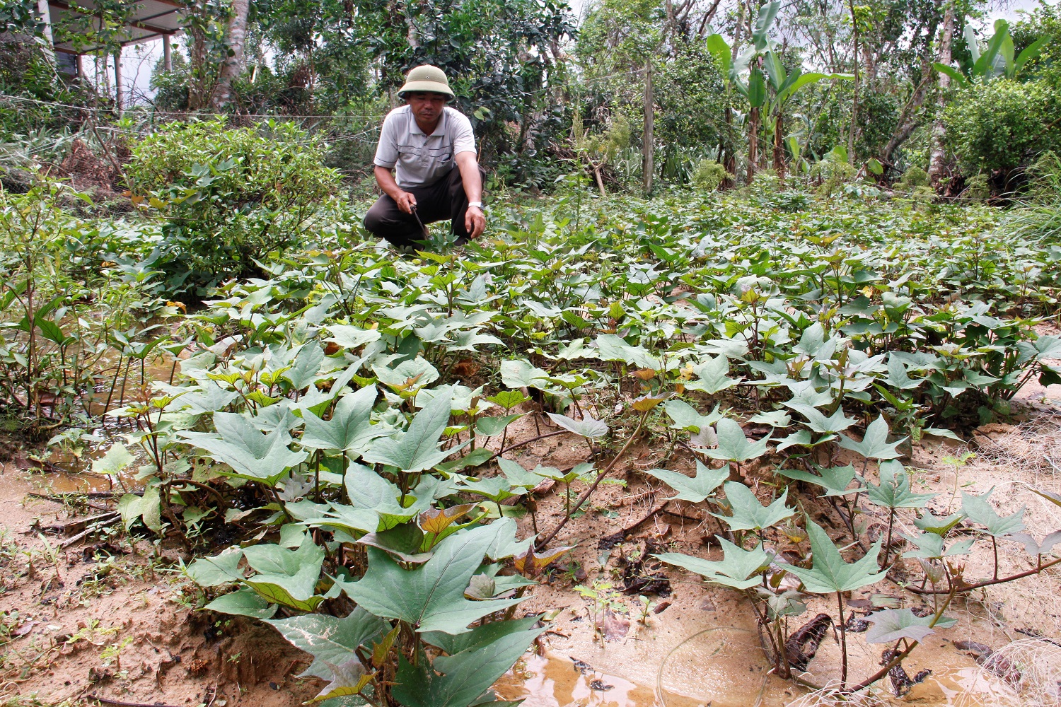 The morning after the storm hit, Nguyen Thi Vinh was greeted with all sorts of felled crops in her field in Village 5, Quang Thach commune: broken banana tree branches, collapsed pepper plants, cassava plants crushed by heavy rains to the ground. What gave her hope was seeing her sweetpotato plants, all 2,000 square meters of them, a little bit humbled, some of their leaves wiped out, but nevertheless still standing and firmly rooted.